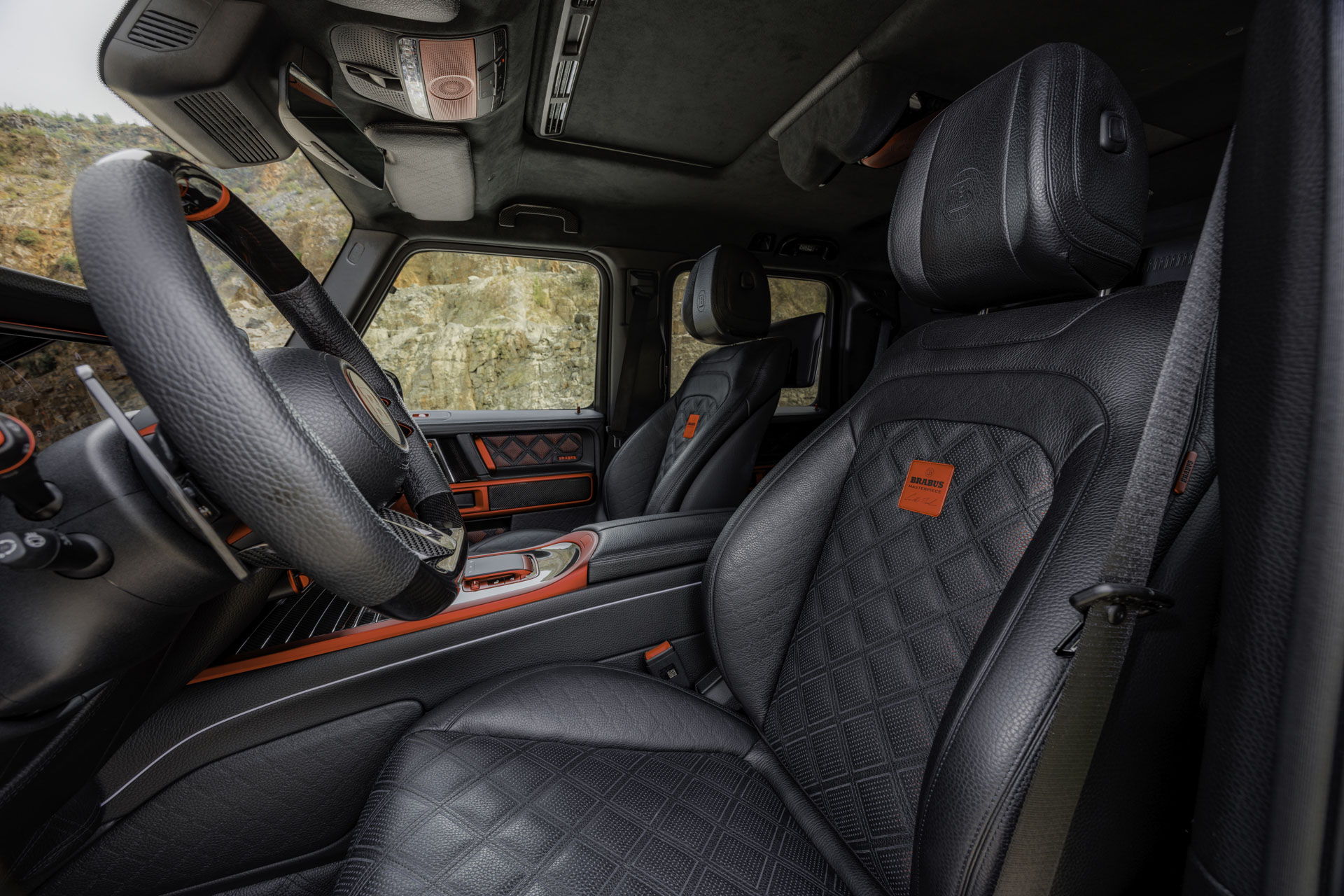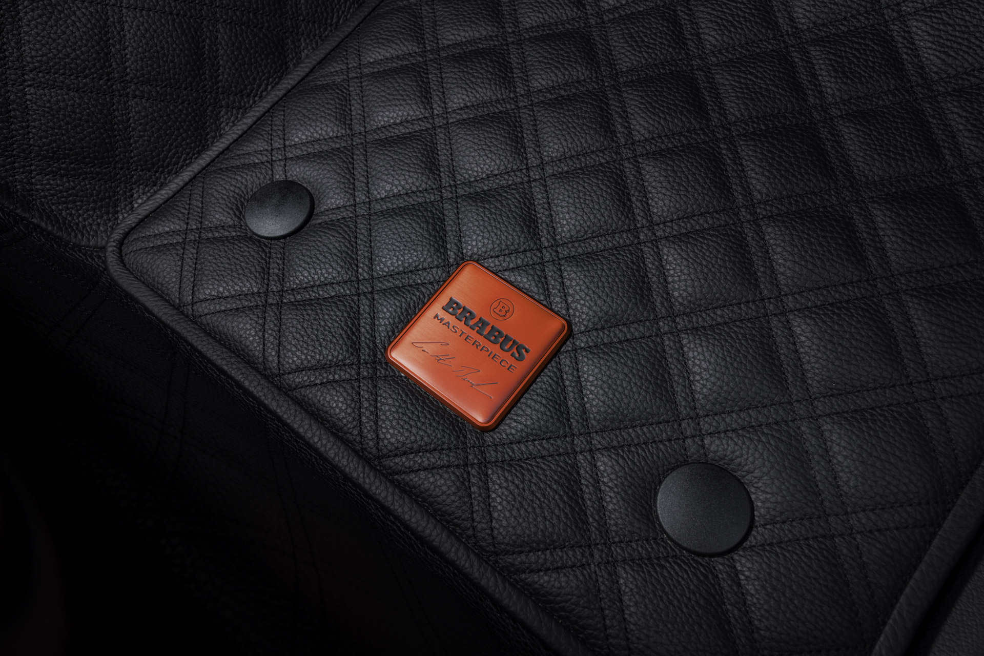 Inside the BRABUS XLP 800 6x6 ADVENTURE, attention to detail takes center stage. Tailored in perfect harmony with the vehicle’s exterior, the cockpit and rear cabin are covered in the finest black leather. Every contour reflects absolute precision—from the meticulously stitched BRABUS “Dual Cube” quilting on the seat surfaces to the perfectly aligned perforations that ensure seamless integration of seat climate control. This signature pattern extends to the inner door panels, sun visors and the leather-trimmed center strip of the Dinamica microfiber headliner, creating a visual and tactile Masterpiece design.