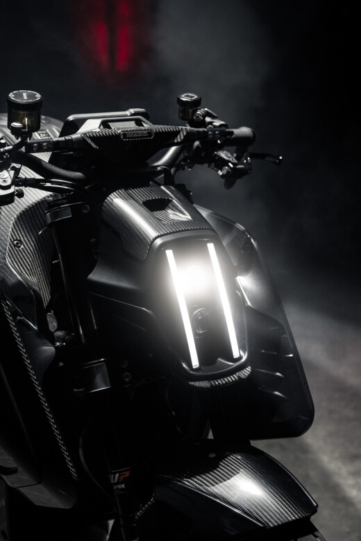 At the front, the BRABUS front fender and LED headlight unit with a unique daytime running light signature inspired by the BRABUS signature stripes take center stage. Framed by a custom-made carbon mask, their distinctive geometry defines the bike’s dynamic face—seamlessly integrating with the internal ram-air intake system for optimized airflow.