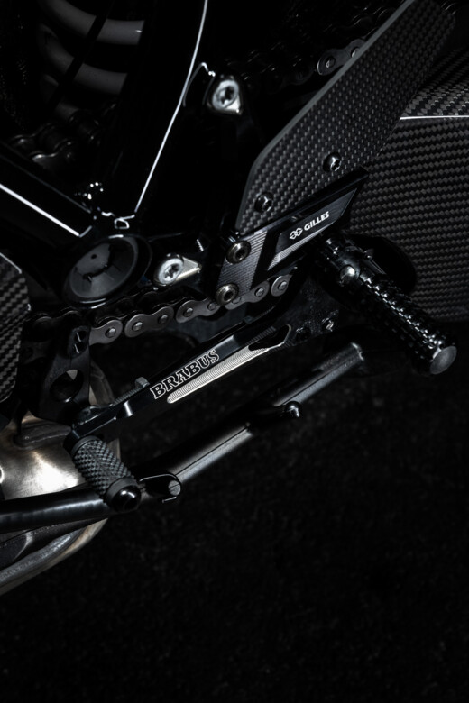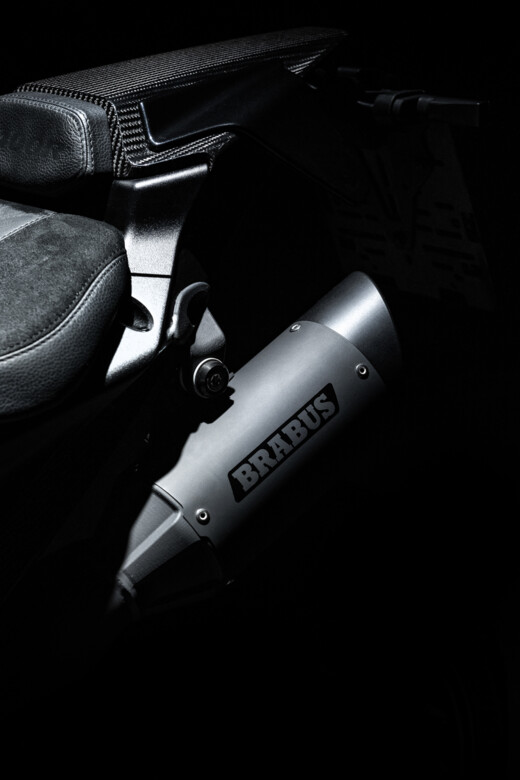 Our engineers developed a special slip-on underseat dual-pipe exhaust positioned beneath the carbon fiber undertray to highlight the 17-inch BRABUS Monoblock II EVO “PLATINUM EDITION” high-end wheels. Additional exposed structure carbon fiber features, such as the rear wheel cover, single swing arm cover and chain guard, complement the look.