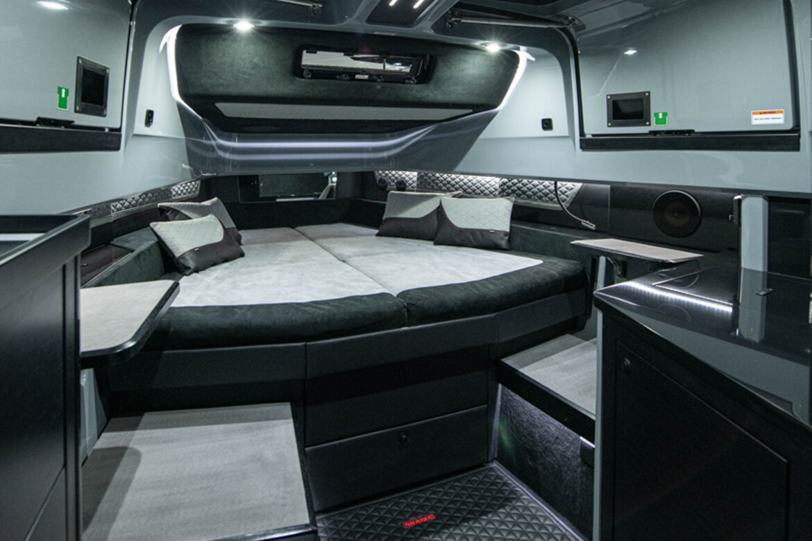 Front lounge and optional aft-cabin in exclusive BRABUS Masterpiece leather in light gray/black color scheme with red accents or BRABUS Masterpiece leather light gray color scheme, and mattress in gray/black square pattern
