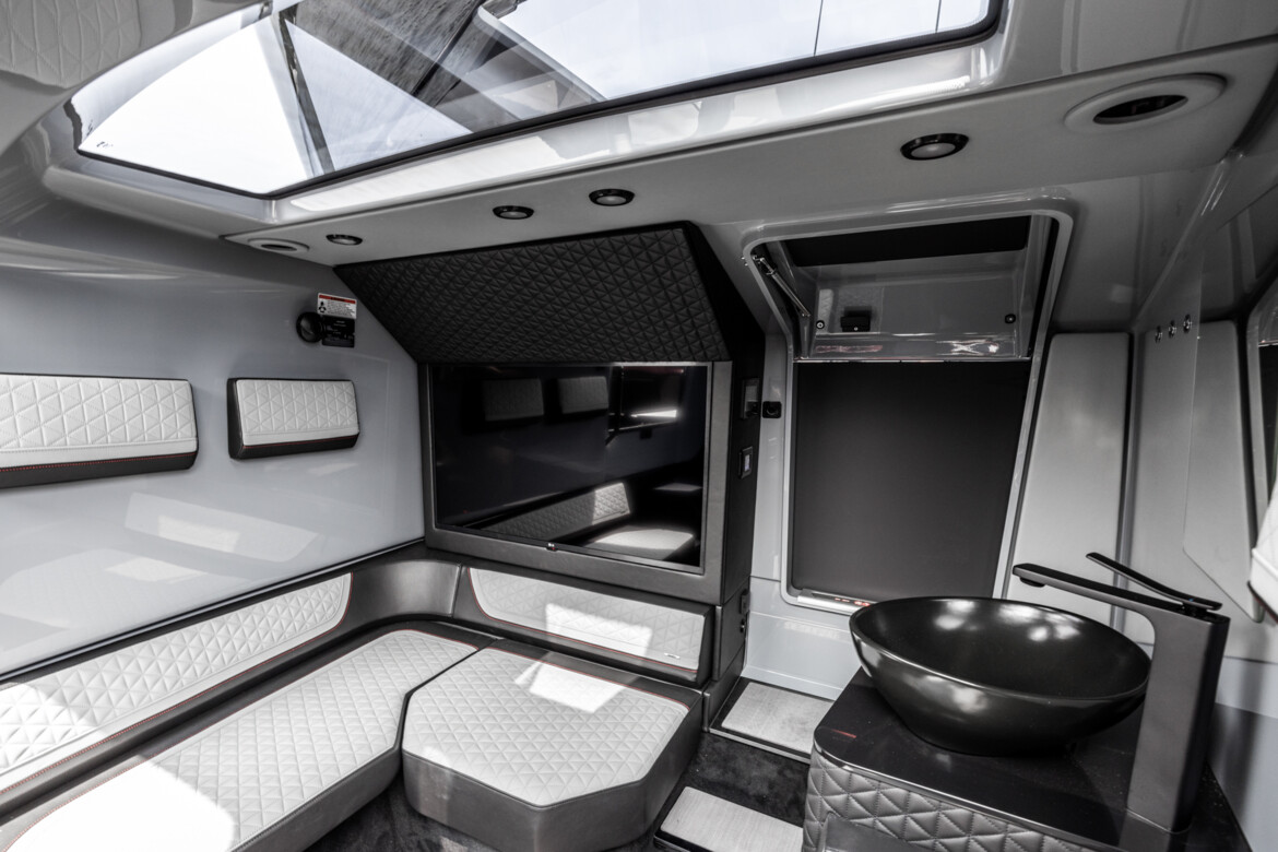 An ultra-luxurious cabin cruiser – Endowed with true ‘go-anywhere’ characteristics, while at the same time offering an extremely convivial environment, with comfortable, raised seating for seven people in the cockpit that effortlessly cossets occupants in the sophisticated luxury and bespoke detailing renowned of a BRABUS superboat. The large sliding electrical opening sun-roof and two large sliding doors open up the cabin to the elements of the day, providing the perfect ambience and lounge area to entertain guests and spent time with your loved ones.