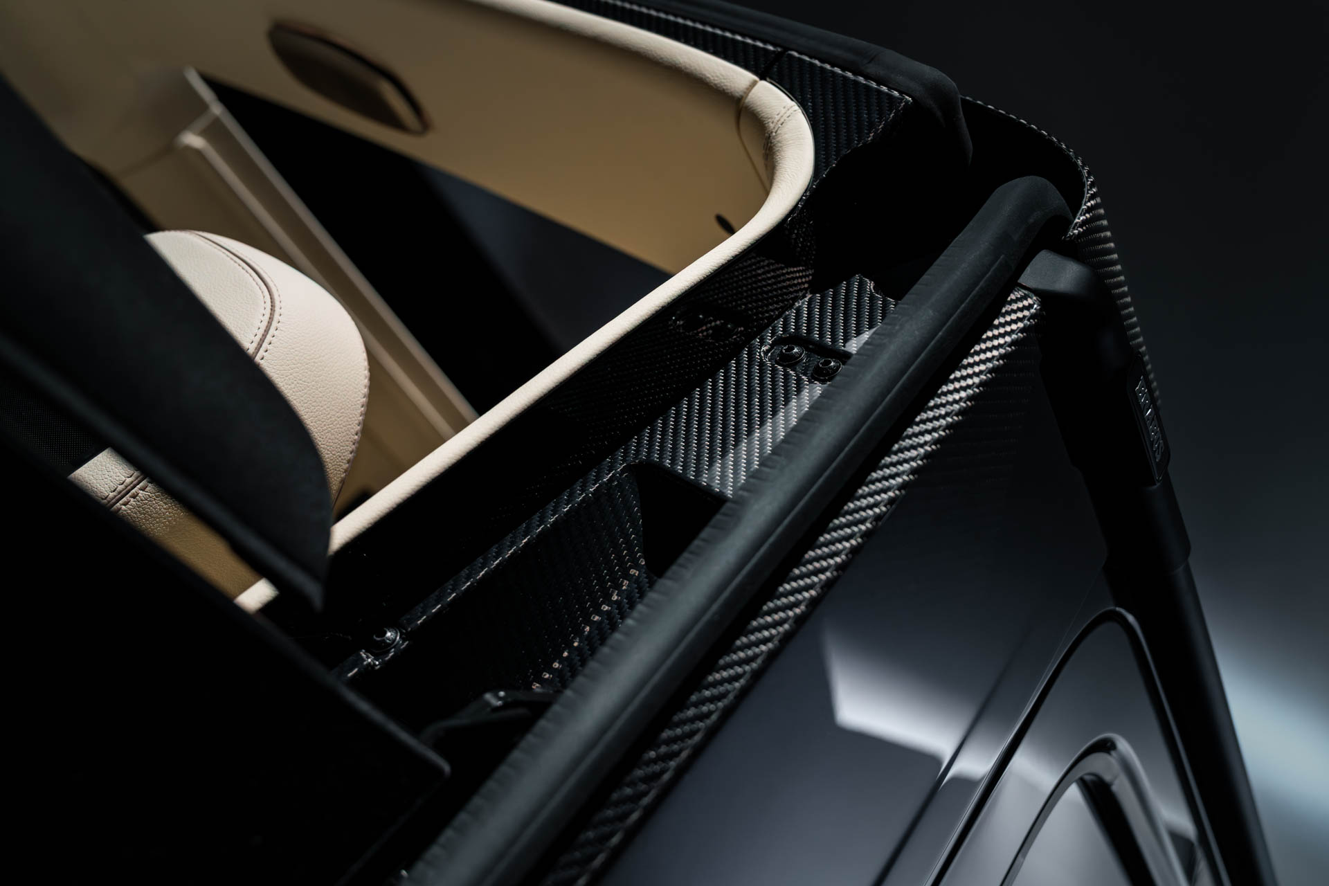 The two-piece soft top opens or closes at the push of a button in just 20 seconds and features a heated safety-glass rear window. A world first, the integrated carbon-fiber surface bow in the front roof segment ensures a stable roof contour and reduced wind noise even at high speeds. At the rear, the soft top transitions cleanly into the body-integrated “C-BOW” steel roll bar, finished with exposed-carbon elements. The rear roof section folds automatically behind the rear seats.