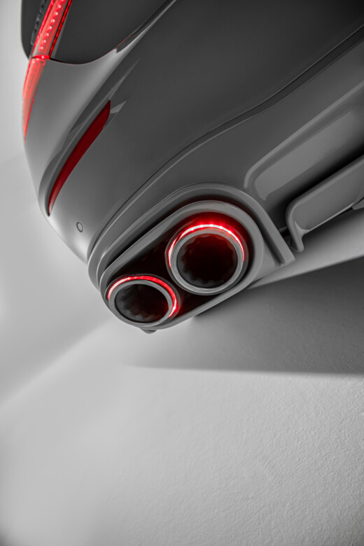 The BRABUS rear lip spoiler was developed for optimal aerodynamic balance. The BRABUS rear diffuser, designed to perfectly highlight the four red illuminated titanium/carbon tailpipes of the BRABUS sports exhaust system, completes the BRABUS 1000 ALL GRAY’s unmistakable 1-Second-Wow effect.