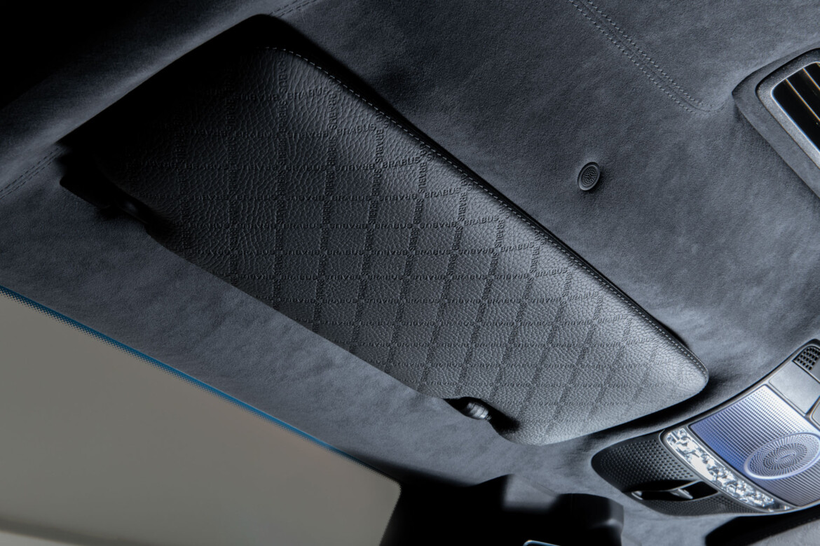 Additional accents include the BRABUS logo pattern adorning the side seat bolsters, select seat surfaces, sun visors and parts of the Masterpiece headliner, all meticulously hand-crafted from the finest slate gray leather. High-grade Alcantara sections blend harmoniously with the leather throughout the cabin, providing an elegant material contrast.