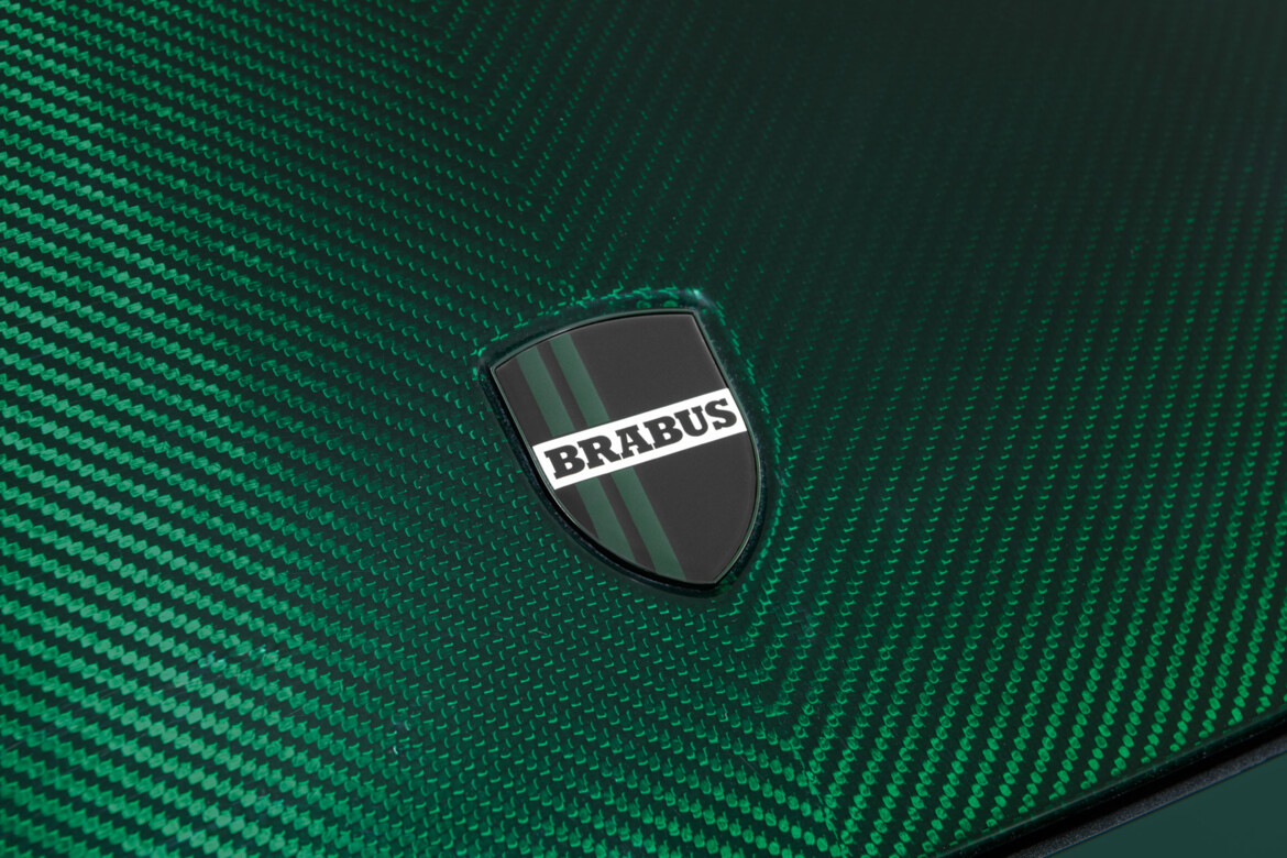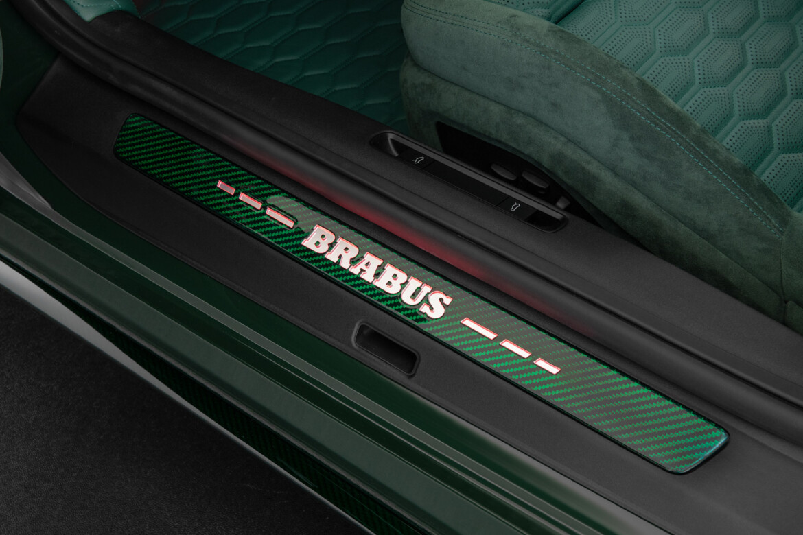 For a fitting touch of sportiness, high-gloss green carbon elements accentuate the center console, door panels, dash board and selected sections of the steering wheel. The BRABUS pedals, made from anodized aluminum, and the carbon entry panels with backlit BRABUS logo elevate the interior's BRABUS typical character. Matte "Shadow Gray" finishes on the air vent surrounds, speaker grilles and switches round out the high-performance luxury feel.