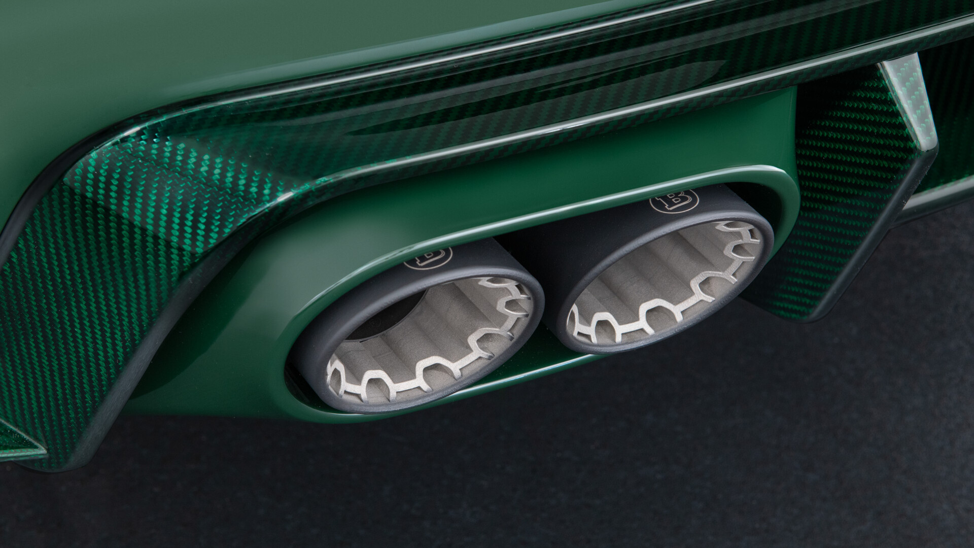 The BRABUS WIDESTAR rear fascia with an integrated BRABUS diffuser, likewise made from high-grade green carbon, perfectly highlights the four show-stopping tailpipes of the BRABUS Inconel exhaust system. Meticulously fine-tuned in the wind tunnel, the design of the tail end not only adds an unmistakable touch of BRABUS but also maximizes downforce alongside the specially developed carbon rear spoiler. Additional green carbon accents like the side mirror covers and BRABUS logo trim between the taillights complete the exterior look, underscoring the supercar's fearless character.