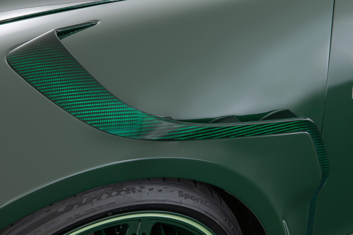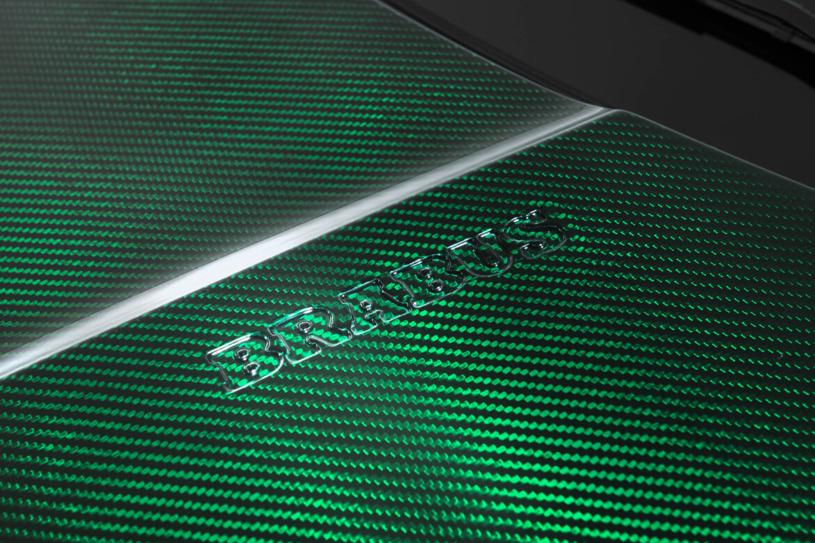 The BRABUS front fascia, equipped with a carbon lip spoiler, sets the tone for its aggressive face, delivering adjustable downforce at high speeds for an electrifying driving experience. The green carbon surrounds guide airflow directly to the radiators and front brakes, ensuring optimal cooling. Air vents in the Kevlar-lined wheel arches efficiently release heat, maximizing cooling efficiency for both next-level form and function. The carbon rocker panels further emphasize the striking wedge shape of the supercar, stretching out its dynamic silhouette to 196.8 centimeters (77.5 in) in width.