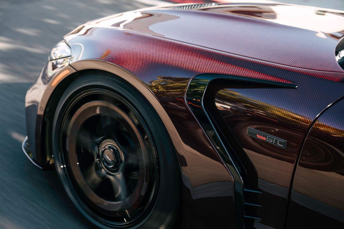 In addition to the thrilling signature styling, the BRABUS ROCKET GTC DEEP RED’s design boasts refined aerodynamics to achieve optimal driving stability at high speeds as well as significant downforce at both the front and rear axles. The BRABUS ROCKET front splitter not only fits perfectly to the wide front fenders on both sides, it also features an integrated spoiler that generates downforce at the front axle at high speeds. The large air intakes direct airflow to the radiators and front brakes.