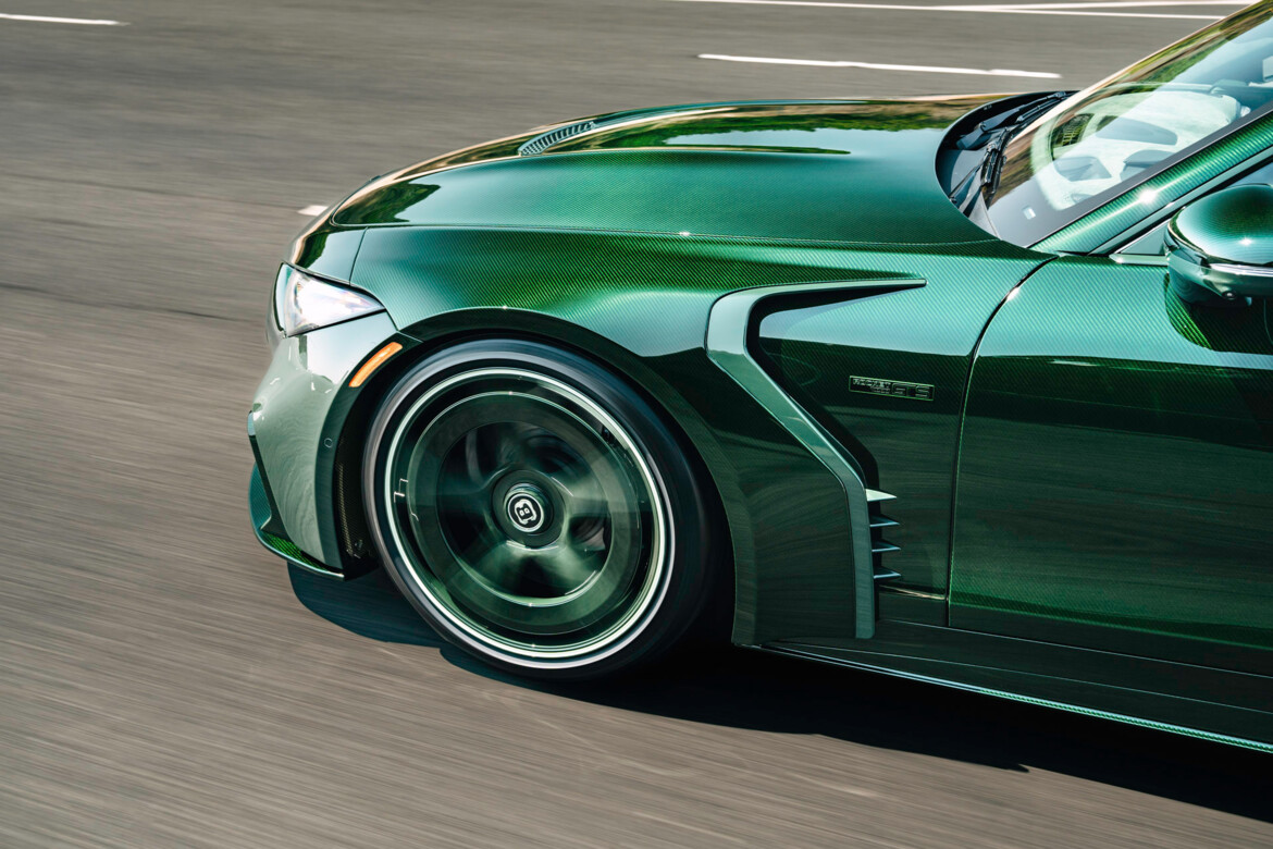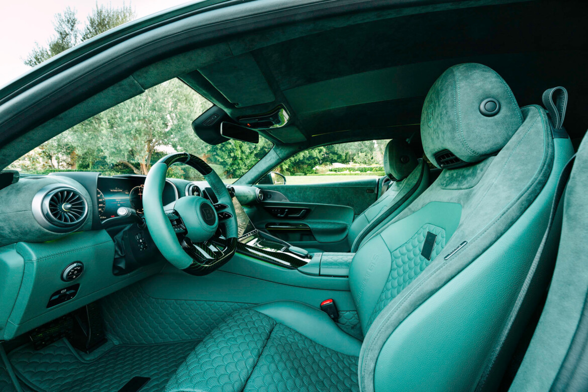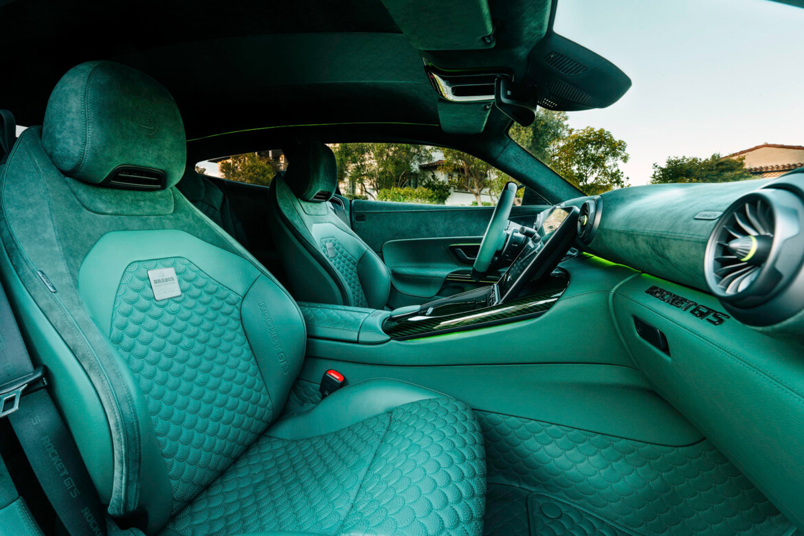 Green exposed-structure carbon also adorns the illuminated entry panels, steering wheel accents, door handles and the center console. All trim elements are finished in matte BRABUS “Shadow Gray.” ROCKET GTS logos on the dashboard, seat belts and door panels serve as exclusive finishing touches.