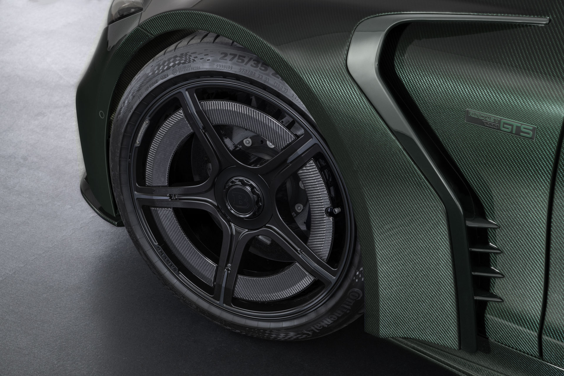 The BRABUS ROCKET GTS MEAN GREEN is equipped with exclusive BRABUS Monoblock P “PLATINUM EDITION” forged wheels. Their five-spoke center-lock design exudes a thrilling motorsport pedigree, while exposed-structure carbon aero-blades are engineered to channel airflow and extract heat from the brake system via rotational dynamics. From the wheels to the suspension hardware, every element is designed for maximum strength, minimal weight and uncompromising performance.