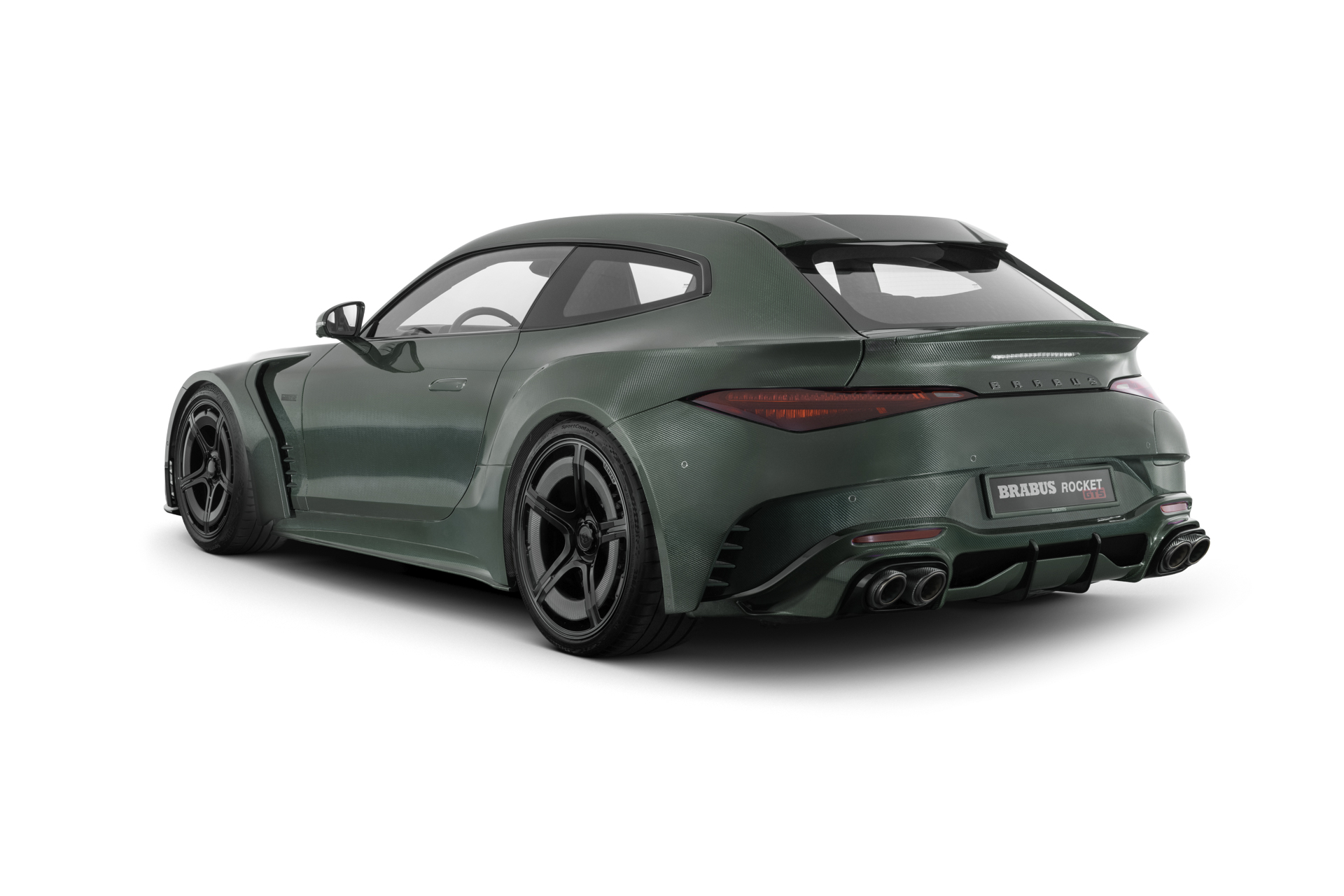 At the front, a bespoke fascia with an integrated carbon-fiber spoiler offers a brand-typical blend of form and function by significantly reducing front axle lift. large air intakes channel vital airflow to cooling systems and high-performance brakes. Along the sides, carbon-fiber skirts lead into the BRABUS ROCKET quarter panels, whose wide, flared arches shape its dynamic shooting brake silhouette and an imposing width of 198.5 cm (78.1 in.).
