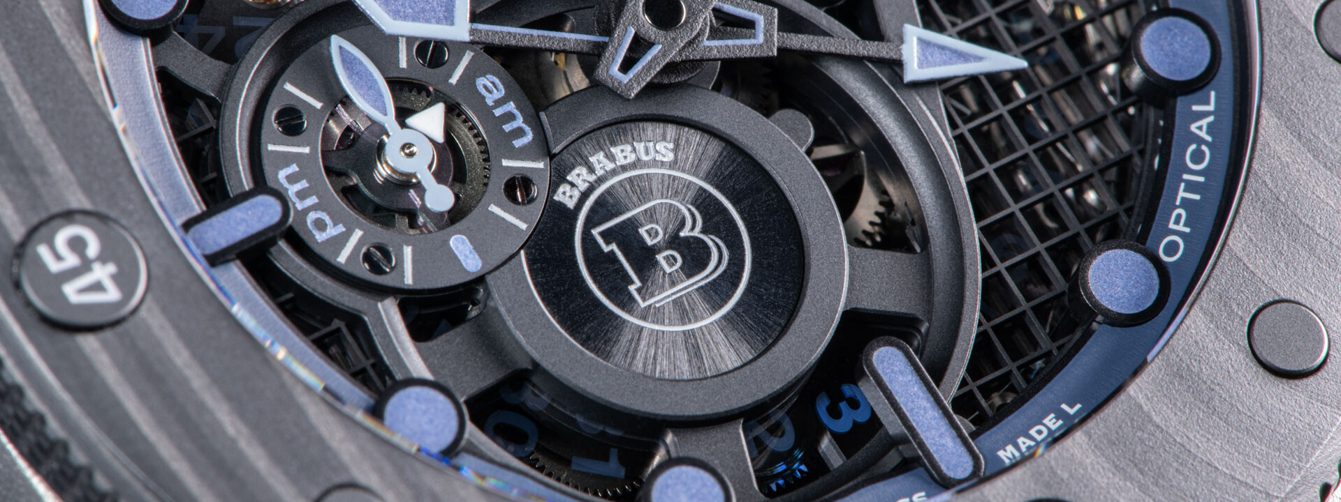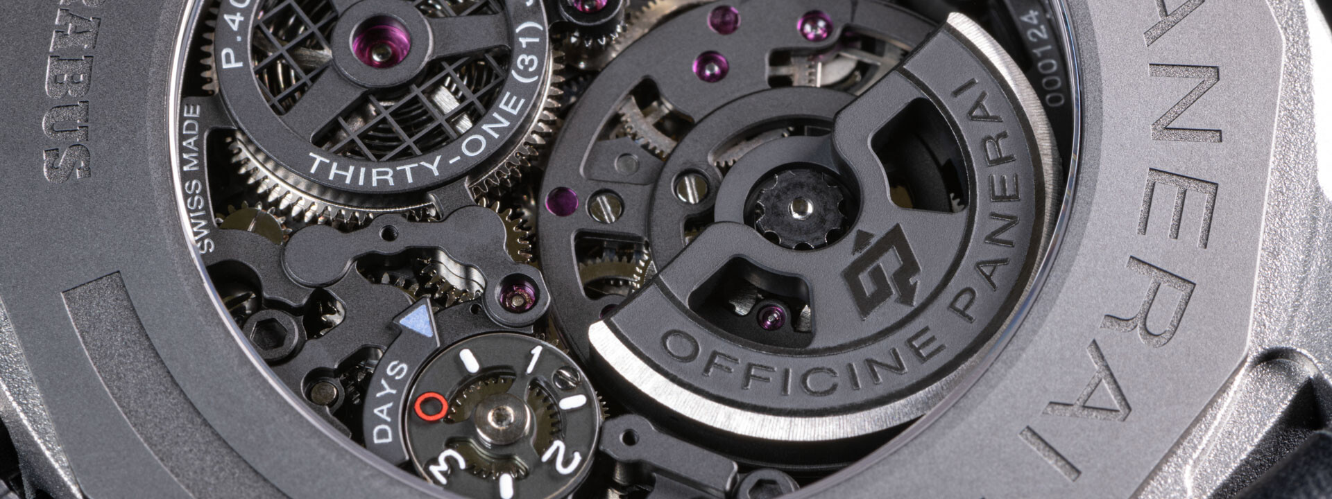 The Panerai Submersible S BRABUS Blue Shadow Edition features the new P.4001/S caliber, a skeletonized movement based on the P.4000 caliber, with a one-piece, off-center oscillating weight that enables bidirectional winding, with the two barrels winding while the watch is worn.